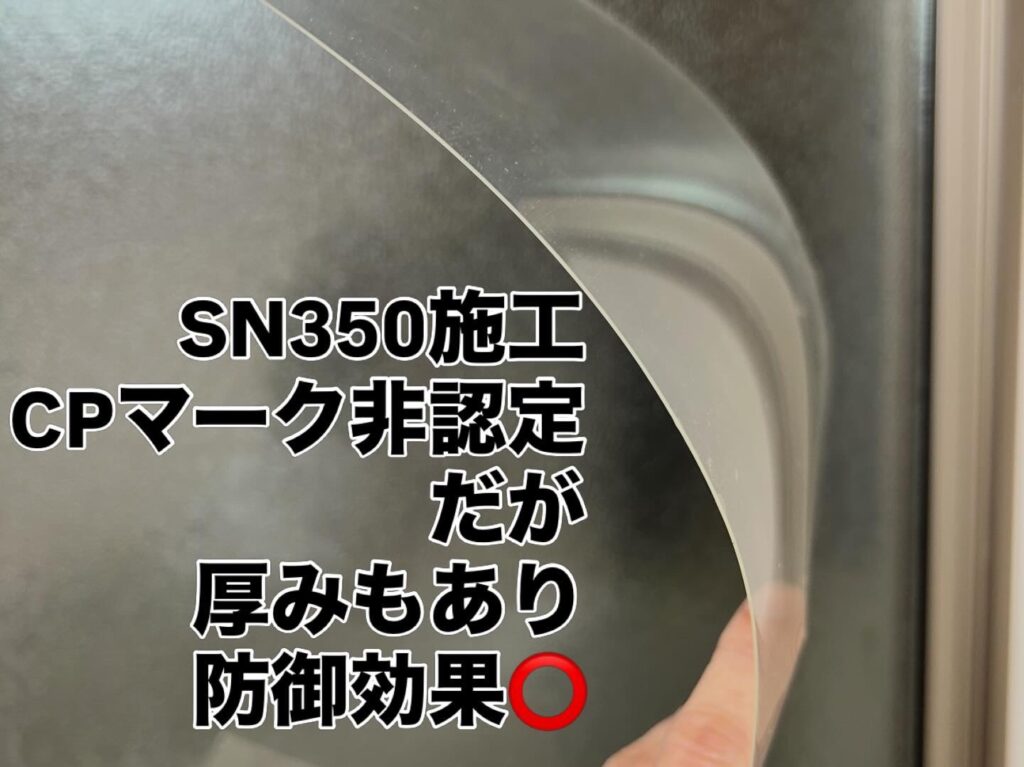 SN350はCPマーク認定品ではありませんが、基材厚約300μmの耐久フィルムです。