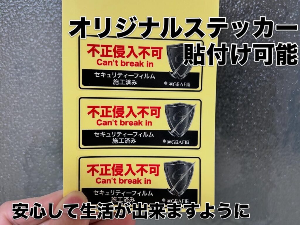 👉実際の使用フィルムは下敷きのような厚みがあります。ステッカーは防犯フィルムが施工してある証明と侵入の抑止にもなります。